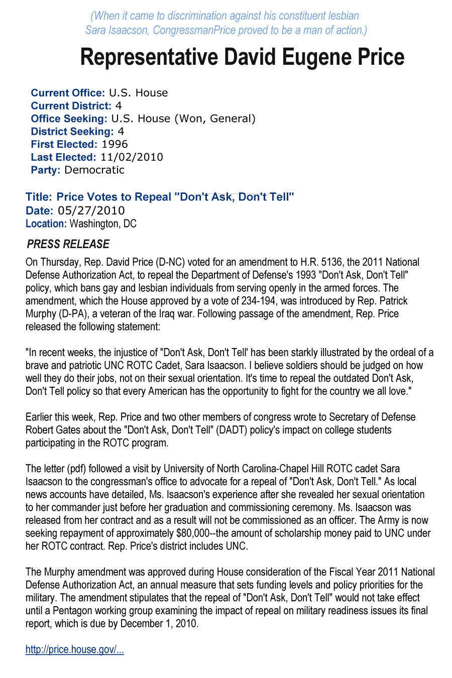 Sara Isaacson Press release by Representative David Price