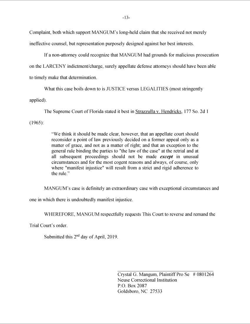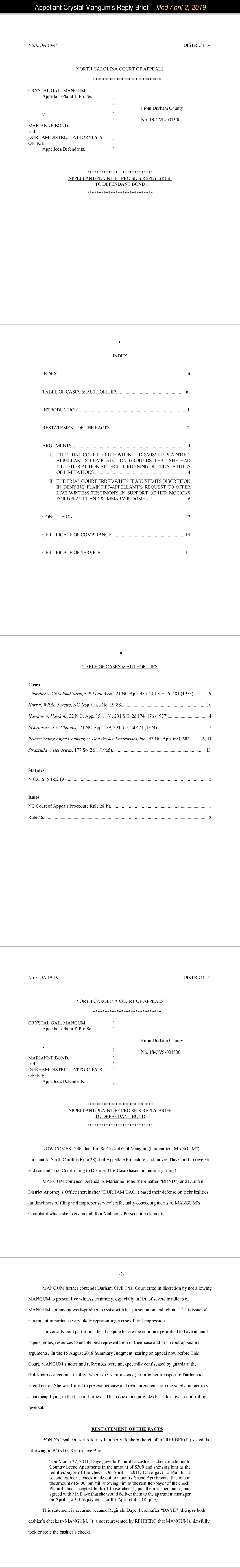 Crystal Mangum's Reply Brief to Bond of April 2, 2019