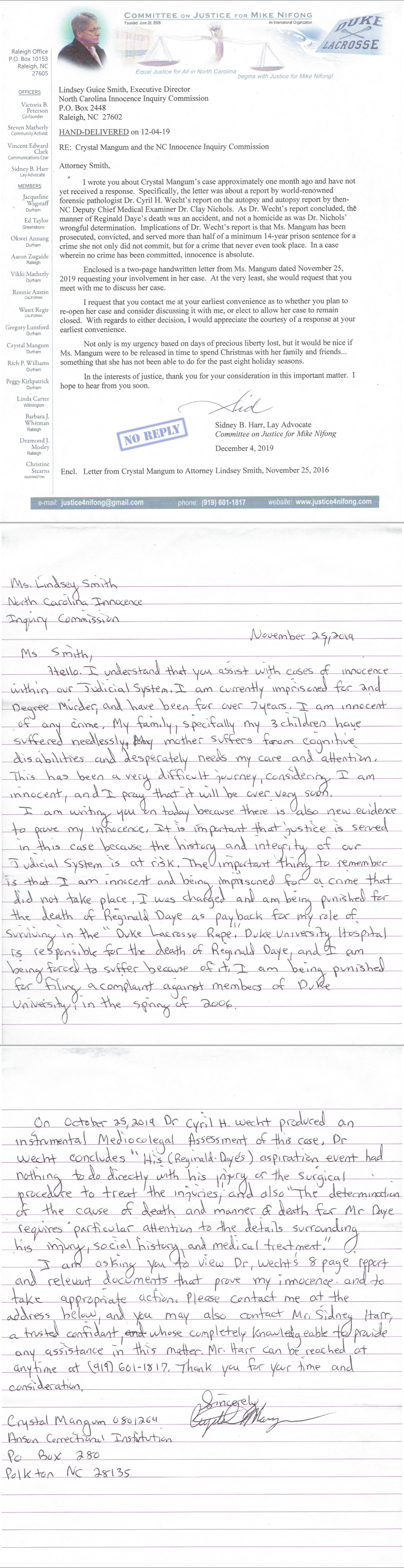 Letter to Lindsey Guice Smith, Executive Director NC Innocence Inquiry Commission dated December 4, 2019