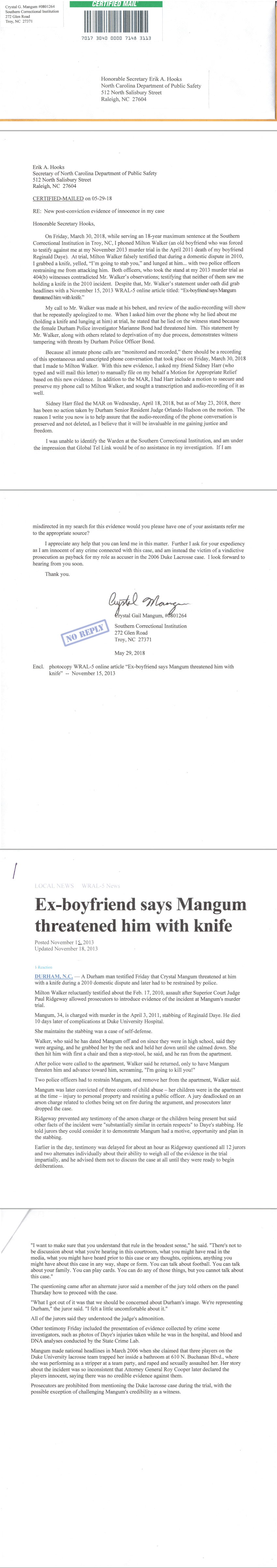 Letter from Mangum to Erik Hooks sent May 29, 2018