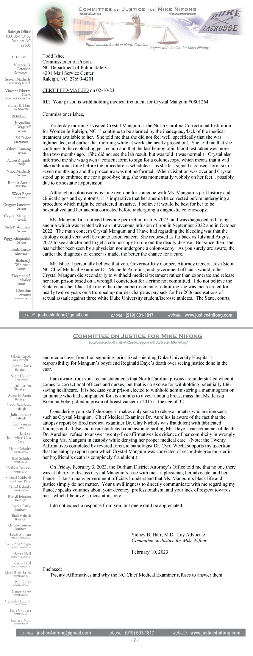 Letter to NC DPS Prison Commissioner Todd Ishee dated February 10, 2023