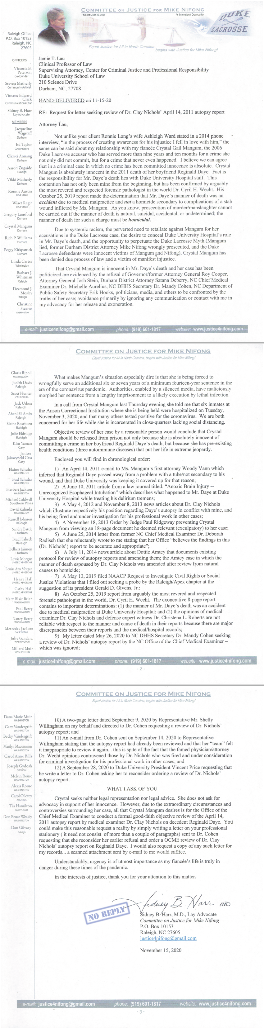 Letter to Jamie Lau, Duke Law Prof dated November 15, 2020