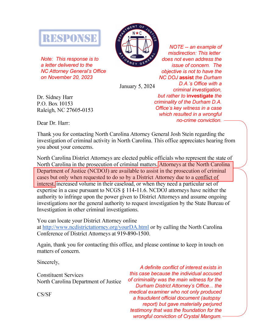 Letter by e-mail from NC DOJ responding to hand-delivery on November 20, 2023, e-mailed January 5, 2023