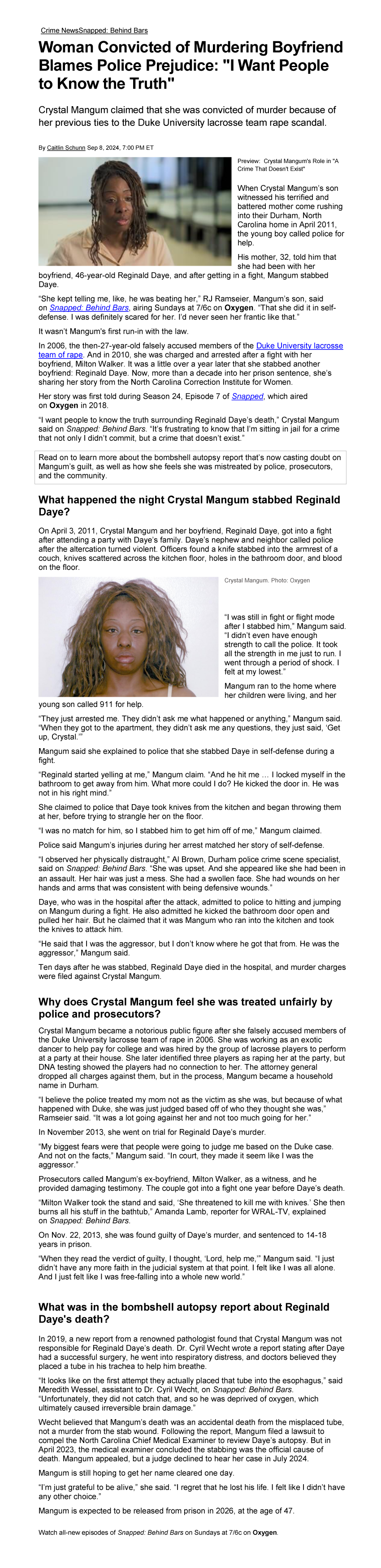 Official Oxygen True Crime news article about Snapped: Behind Bars dated August 28, 2024