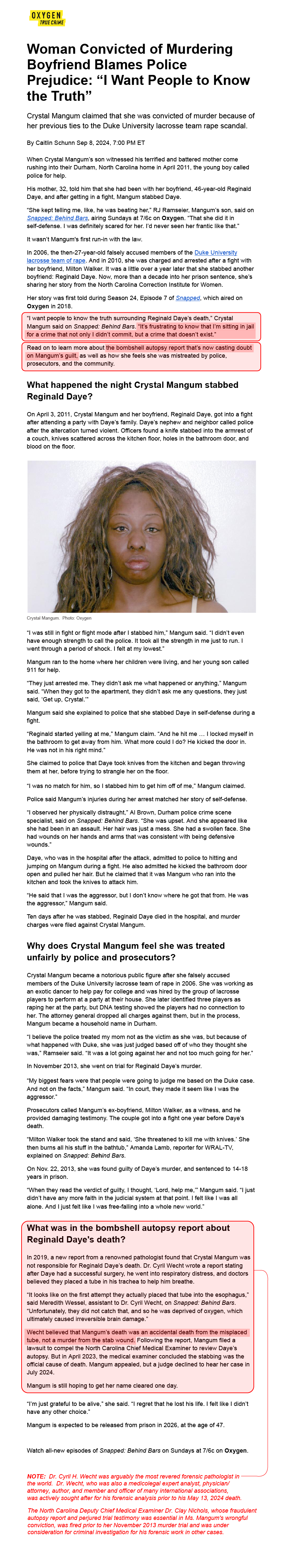 News article -- Oxygen True Crime "Woman who murdered boyfriend..." with notations