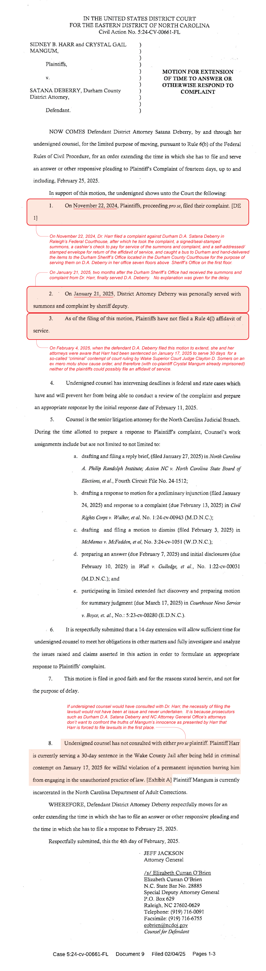 State Motion for Extension of Time to File Response in Harr,Mangum v. Satana Deberry