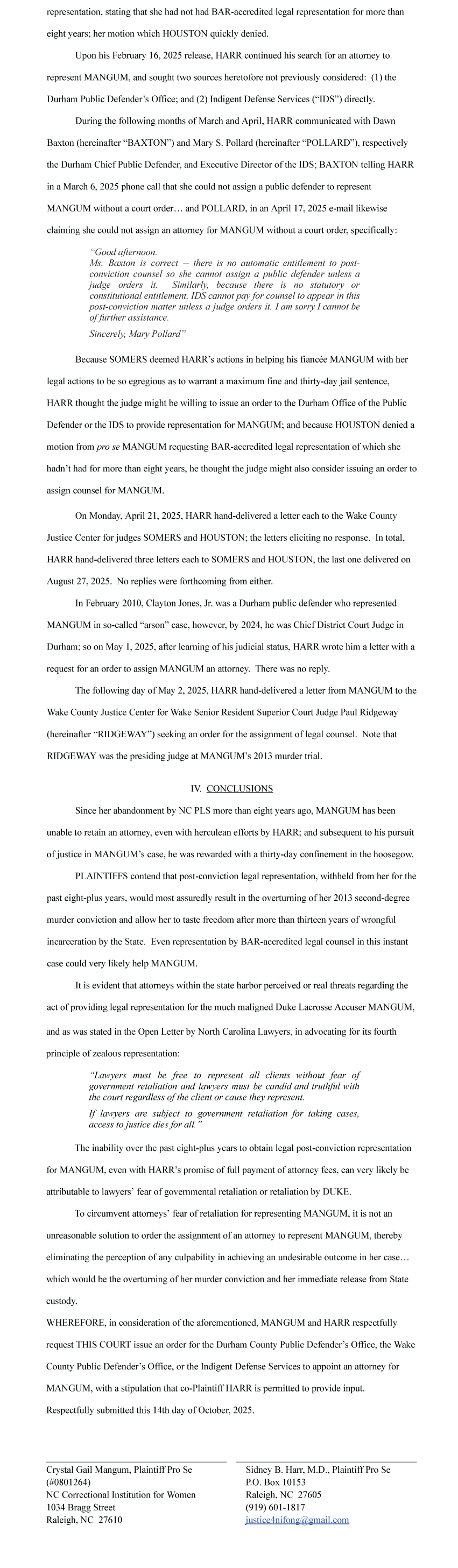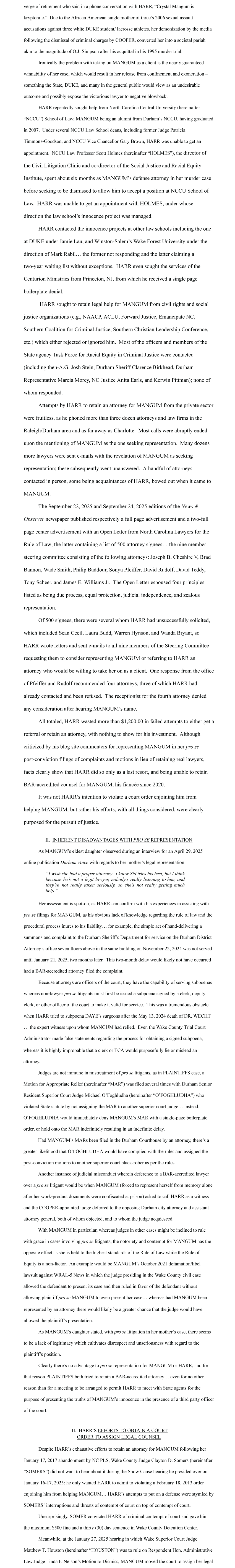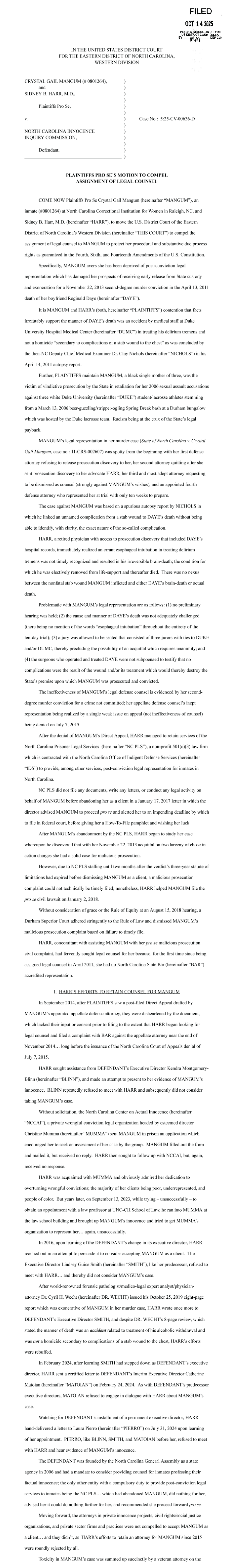 Motion to compel Assignment of Counsel Mangum, Harr v. NC Innocence Inquiry Commission
