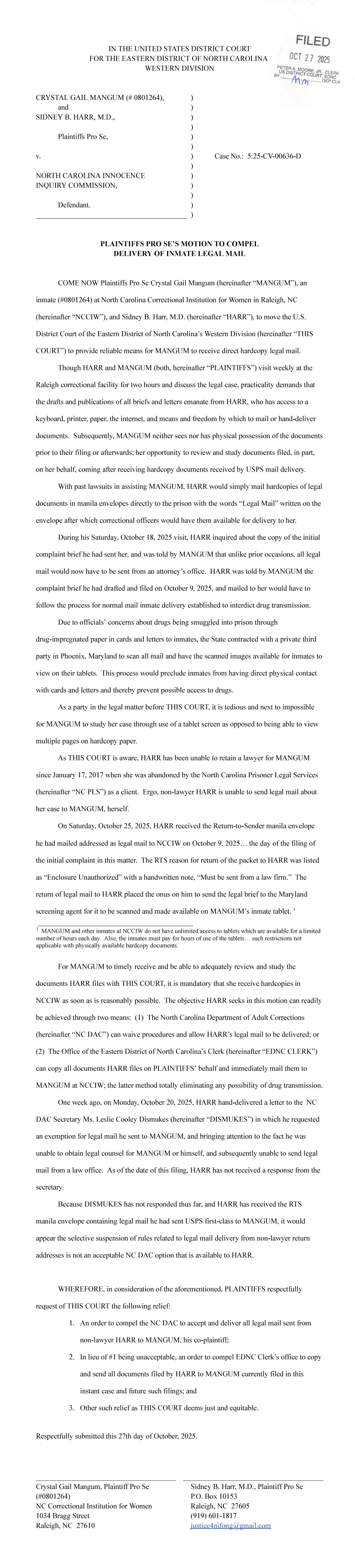 Motion to compel Delivery of Inmate Mail -- Mangum, Harr v. NC Innocence Inquiry Commission