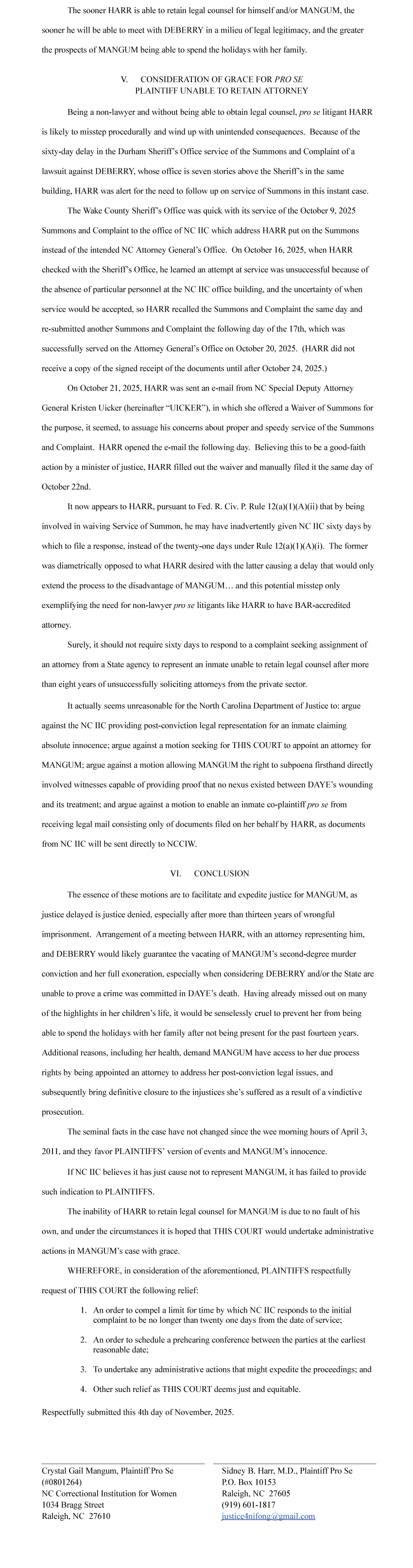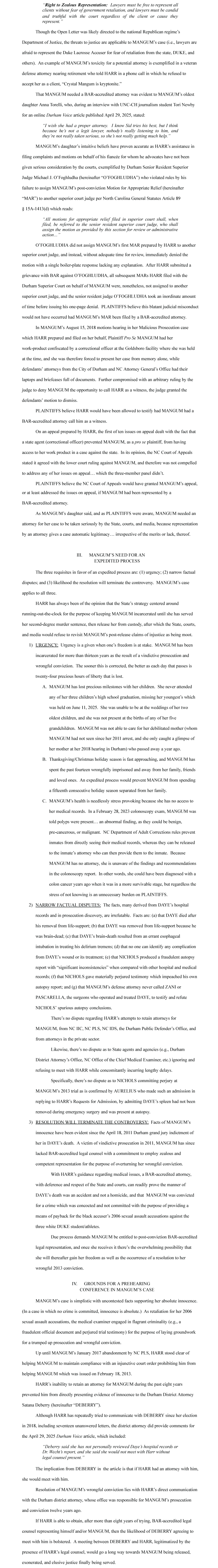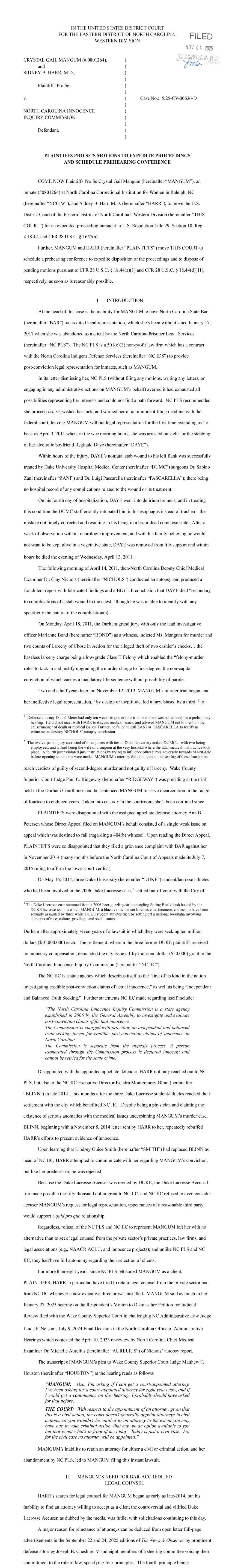 Motion to compel Expedited Process and Prehearing Conference -- Mangum, Harr v. NC Innocence Inquiry Commission