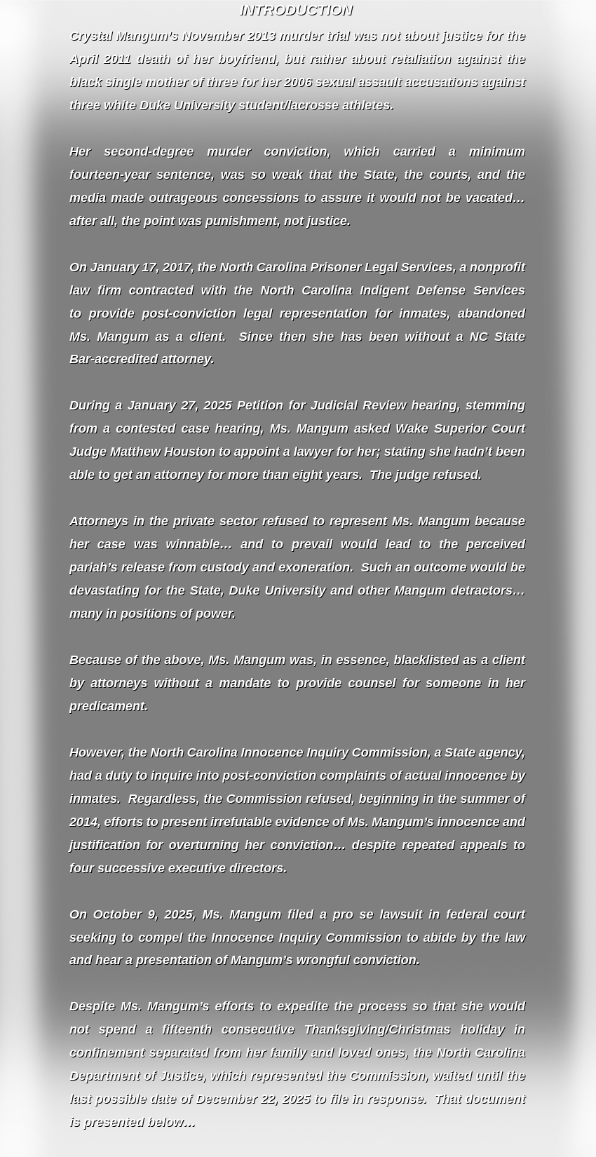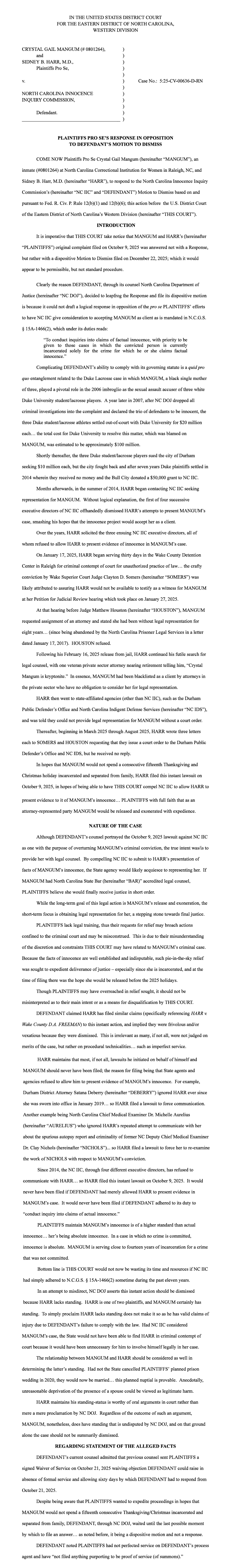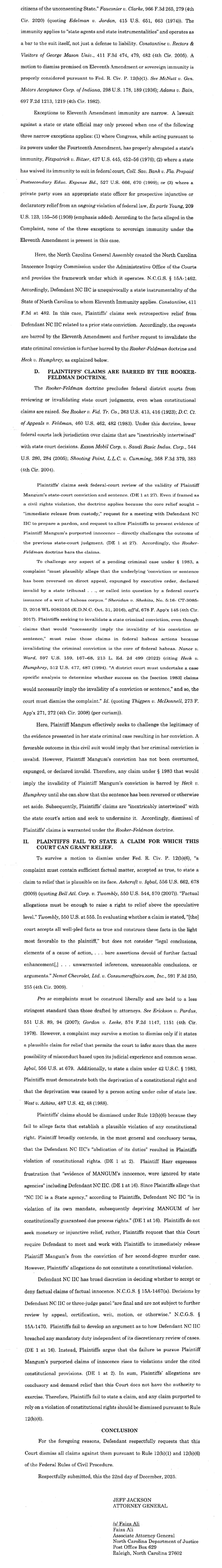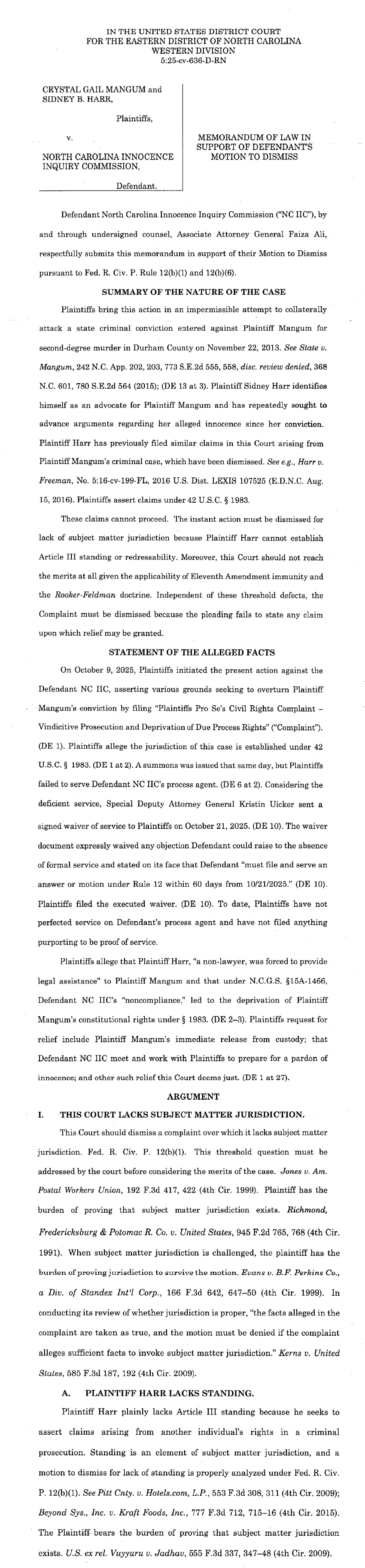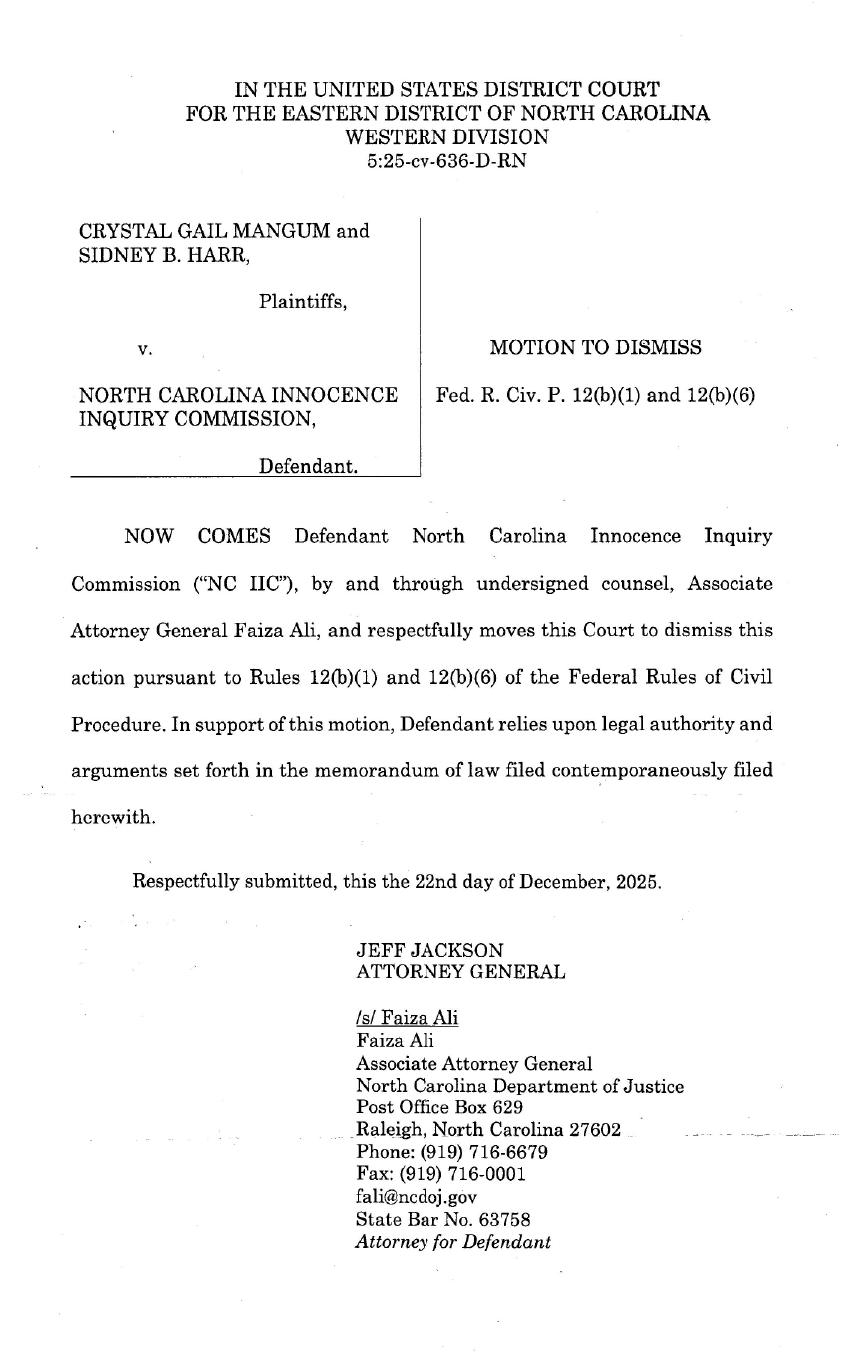 Defendant's Motion to Dismiss and Memorandum in Support -- Mangum, Harr v. NC Innocence Inquiry Commission