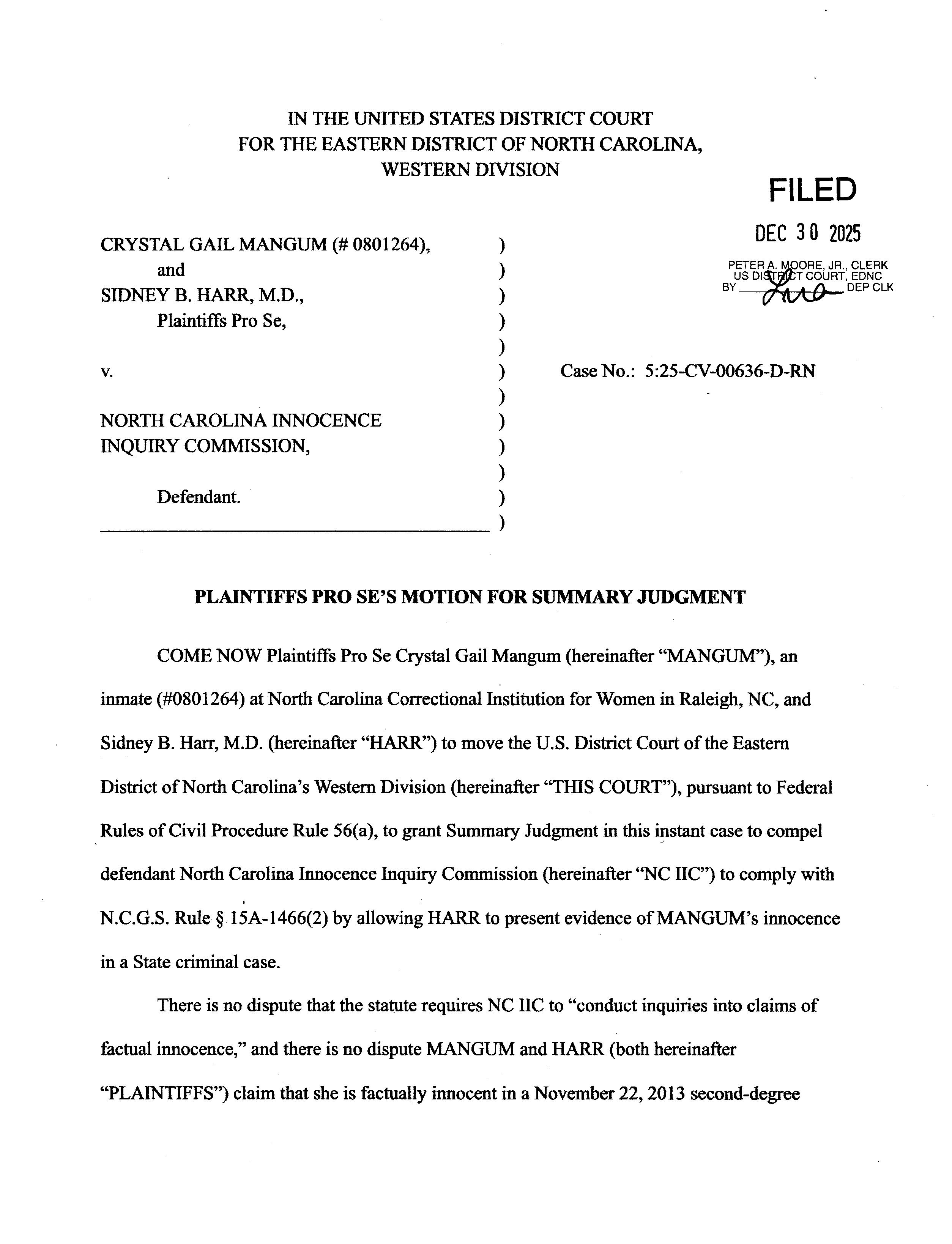 Plaintiffs'Motion for Summary Judgment -- Mangum, Harr v. NC Innocence Inquiry Commission