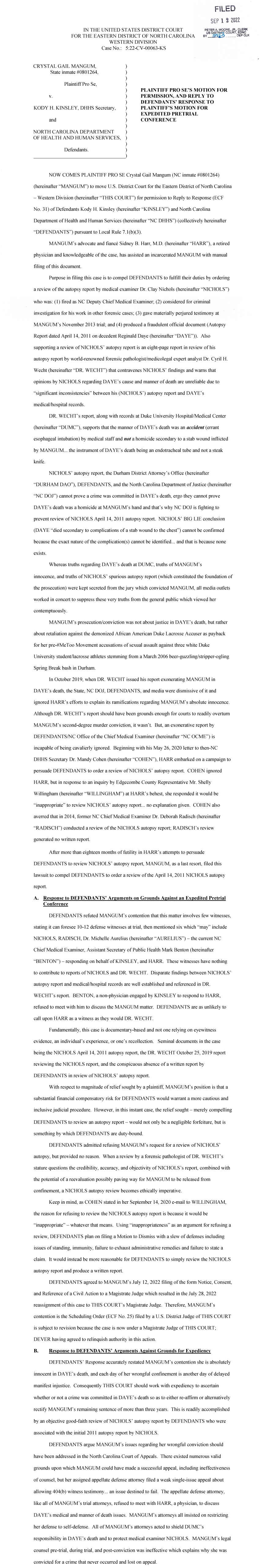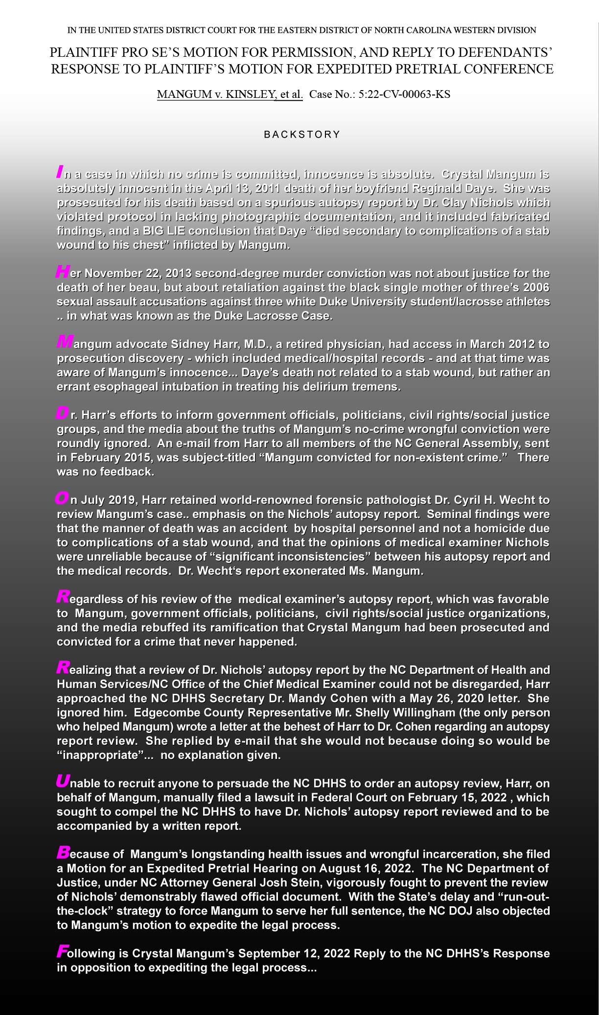 Mangum v. DHHS et al.: Reply to Defendants' Response to Motion for Expedited Hearing