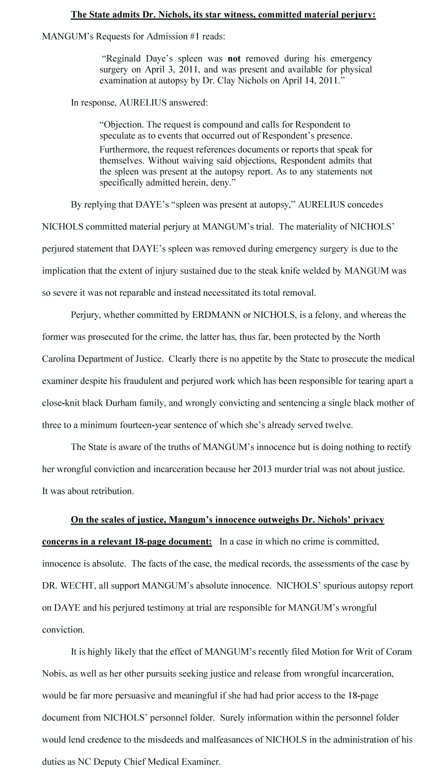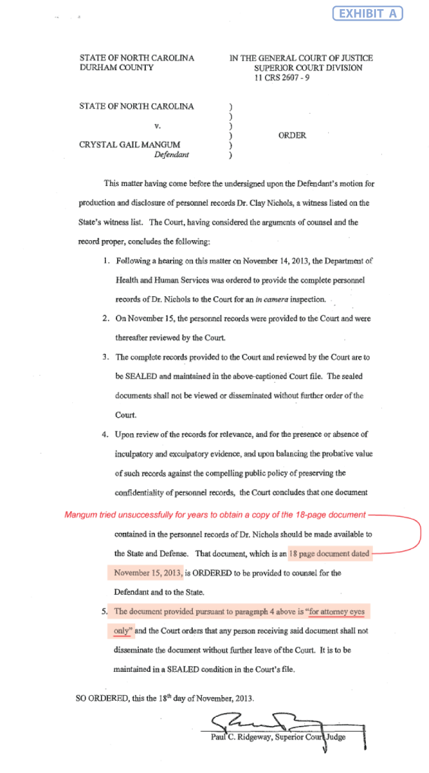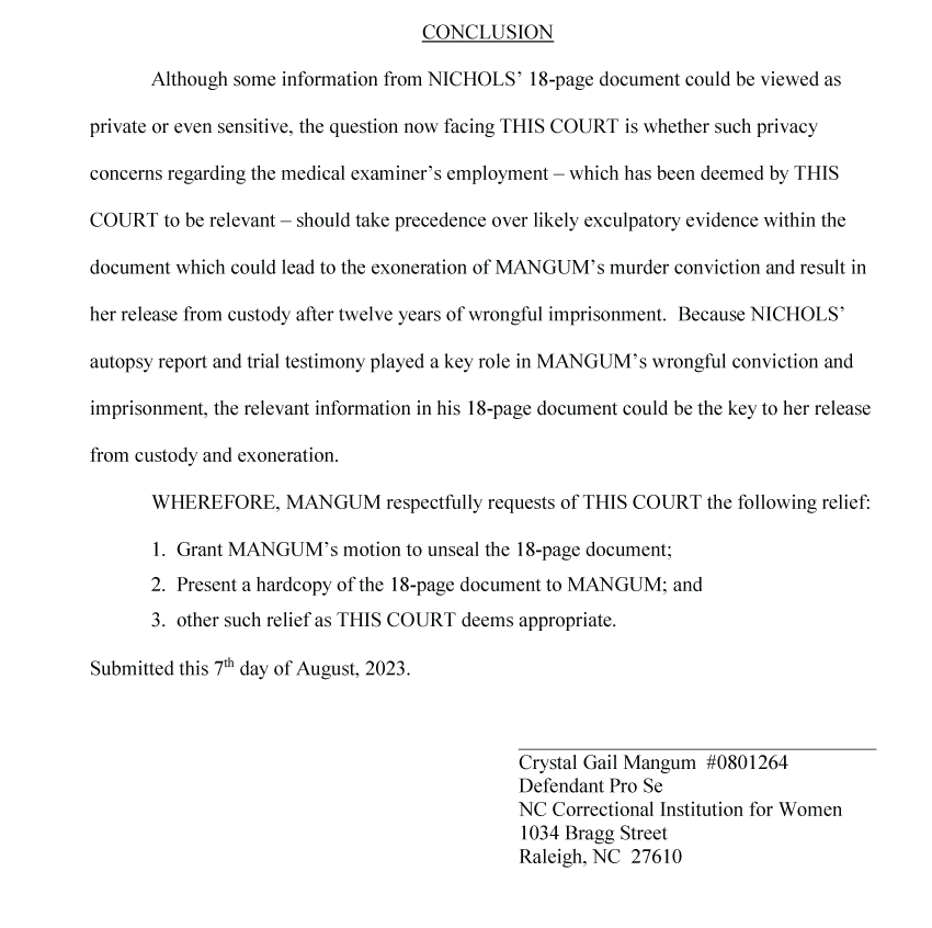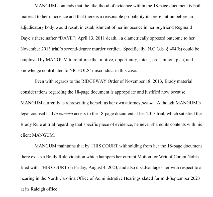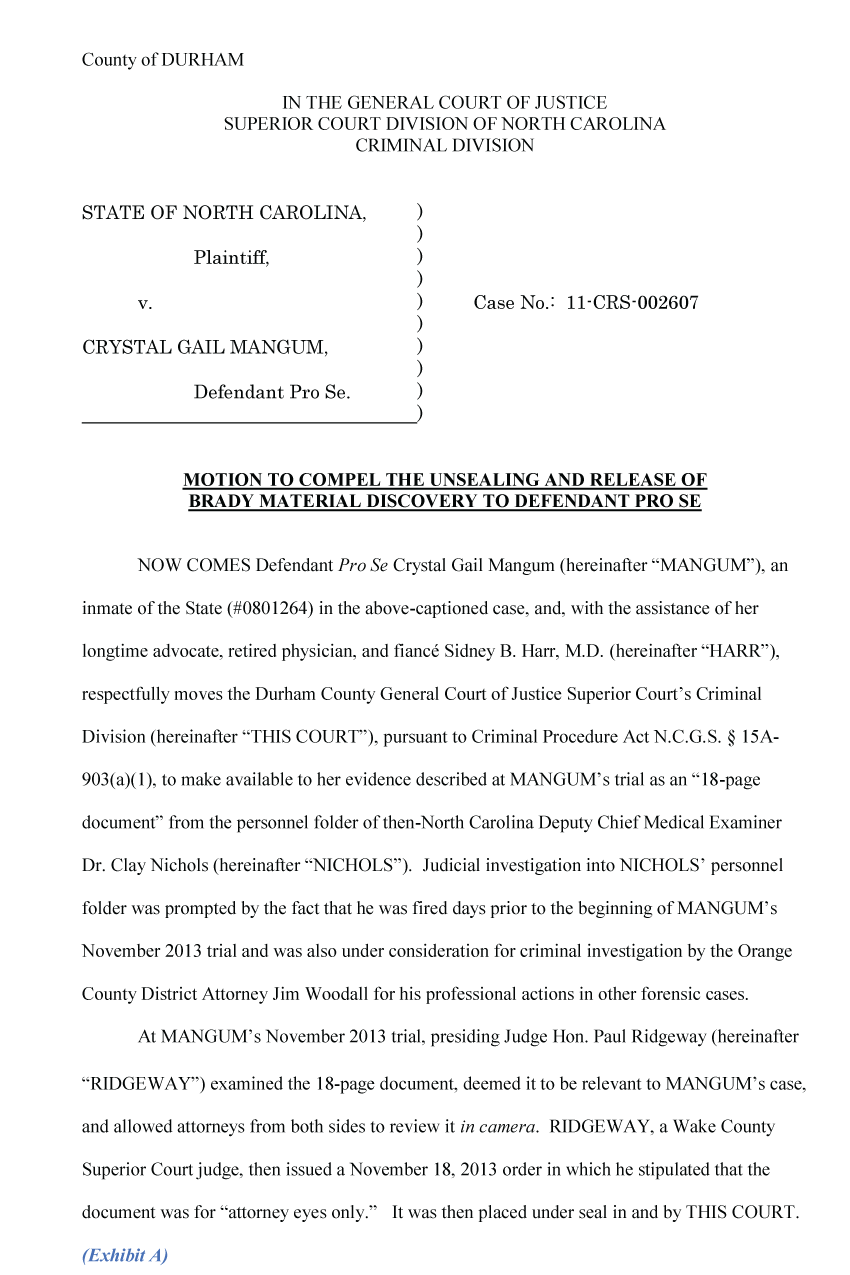 Crystal Mangum's Motion to compel Brady Material discovery to Defendant filed August 7, 2023