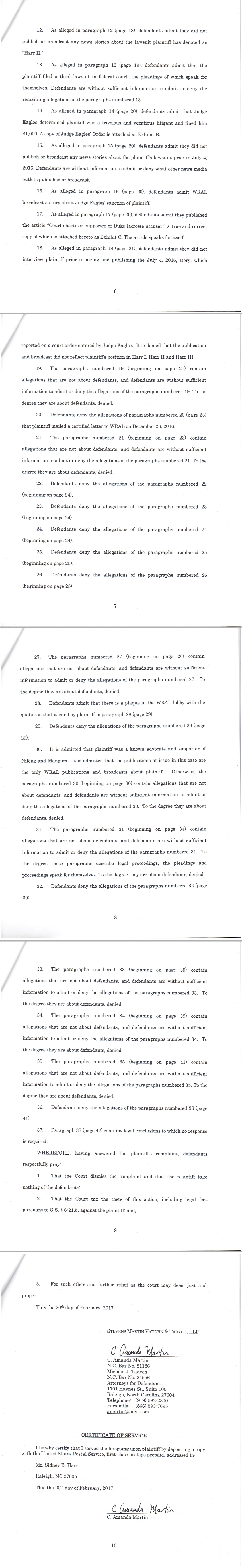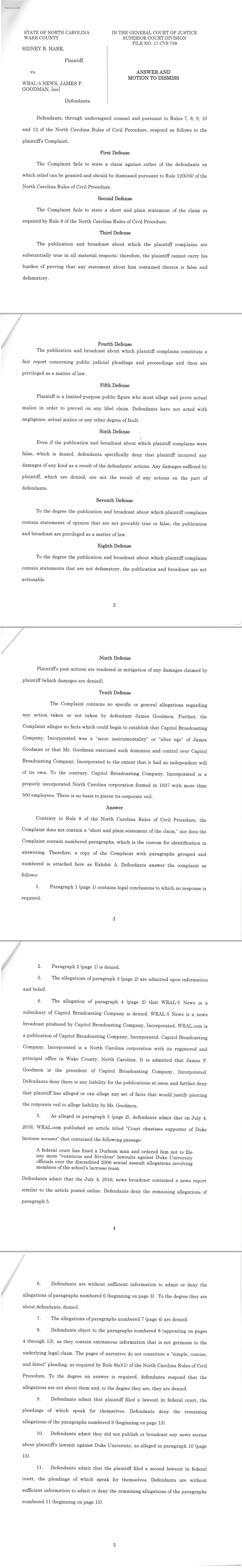 Harr v. WRAL: Defendants's Answer and Motion to Dismiss